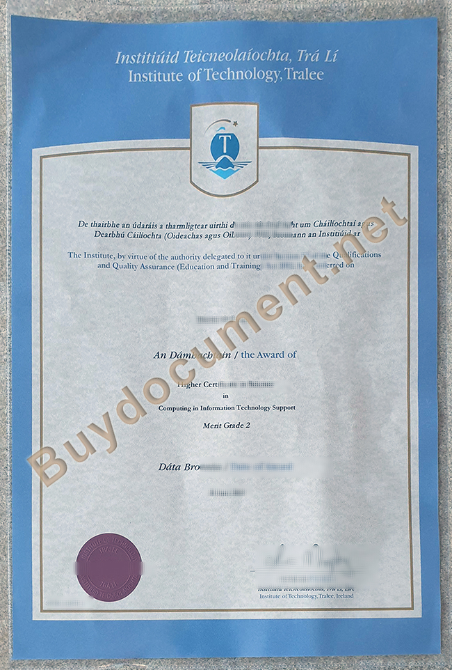 Buy Ireland Institute of Technology, Tralee Diploma, Fake Institute of Technology, Tralee Certificate For Sale, Make Institute of Technology, Tralee Fake Diploma, Institute of Technology, Tralee (ITT or IT Tralee) is a third-level educational institution located in Tralee, County Kerry, Ireland. It was established in 1977 as the Regional Technical College, Tralee. The Institute has two campuses- the North campus (located in Dromtacker) and the South campus (located in Clash) approximately 2.4 km (1.5 mi) apart. Buy Ireland Fake Degree, How to Get Institute of Technology, Tralee Diploma, Obtain Institute of Technology, Tralee Fake Certificate, It has the following Schools and Departments: School of Business, Computing and Humanities located in the North campus: Creative Media and Information Technology Department Business Department Hotel, Culinary Arts and Tourism Department Computing Department School of Science, Technology, Engineering and Mathematics located in the South campus: Technology, Engineering and Mathematics Department Biological and Pharmaceutical Science Department Apprentice Section School of Health and Social Sciences: Health and Leisure Studies Department located in the South campus Social Sciences Department located in the North Campus Nursing and Health Care Sciences Department located in the North campus The South campus has been in operation since the opening of the Institute in 1977. The North campus opened in 2001. The continuing development of the North campus will eventually lead to the entire institute being relocated to Dromtacker.