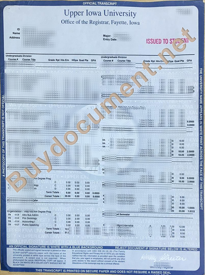 Sample transcript from Upper Iowa University. How to create an Upper Iowa University transcript? Official transcript of Upper Iowa University. A degree certificate issued by Upper Iowa University. Graduated from Upper Iowa University. How to search the course code on the transcript? How To Order Fake Upper Iowa University Diploma, Buy Upper Iowa University transcript Online, Order Upper Iowa University Certificate, Buy Fake US Certificate.